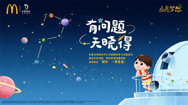 4月26日,麦当劳中国正式宣布,携手“中国探月”,共同启动2023年“点亮梦想”活动。即日起,消费者前往全国超5000家麦当劳餐厅购买开心乐园餐,或在超2000家的麦当劳家庭主题餐厅预约参加“点亮梦想”主题派对,就能得到一张定制画纸,画出自己的问题,可以获得一条惊喜回答,还能得到“中国探月”盖章认证的电子证书。提问小朋友中的优胜者,最后还有机会“拥有”一颗星星。