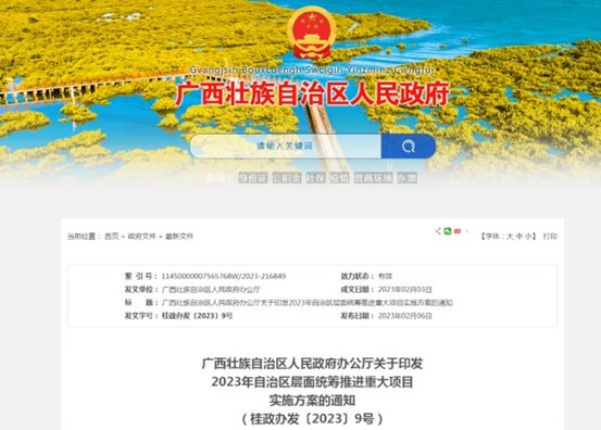 近日,广西壮族自治区人民政府办公厅发布《2023年自治区层面统筹推进重大项目实施方案》(下简称《方案》)提出,深入实施《广西重大项目建设三年行动计划(2021—2023年)》,继续推进一批重大项目加快建设,力争全年完成投资5000亿元以上,新开工项目360个以上,努力实现质的有效提升和量的合理增长,为全面建设新时代壮美广西开好局起好步。