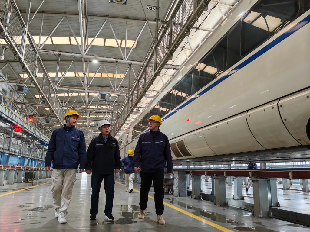 走进西安动车段动车组检查库,一列列长途奔波的动车缓缓驶入。身着深蓝色工作服的董宏涛正在给几名青年技工进行技术指导,耐心传授着工作经验。春运期间,董宏涛和同事们比平日更忙碌了。
