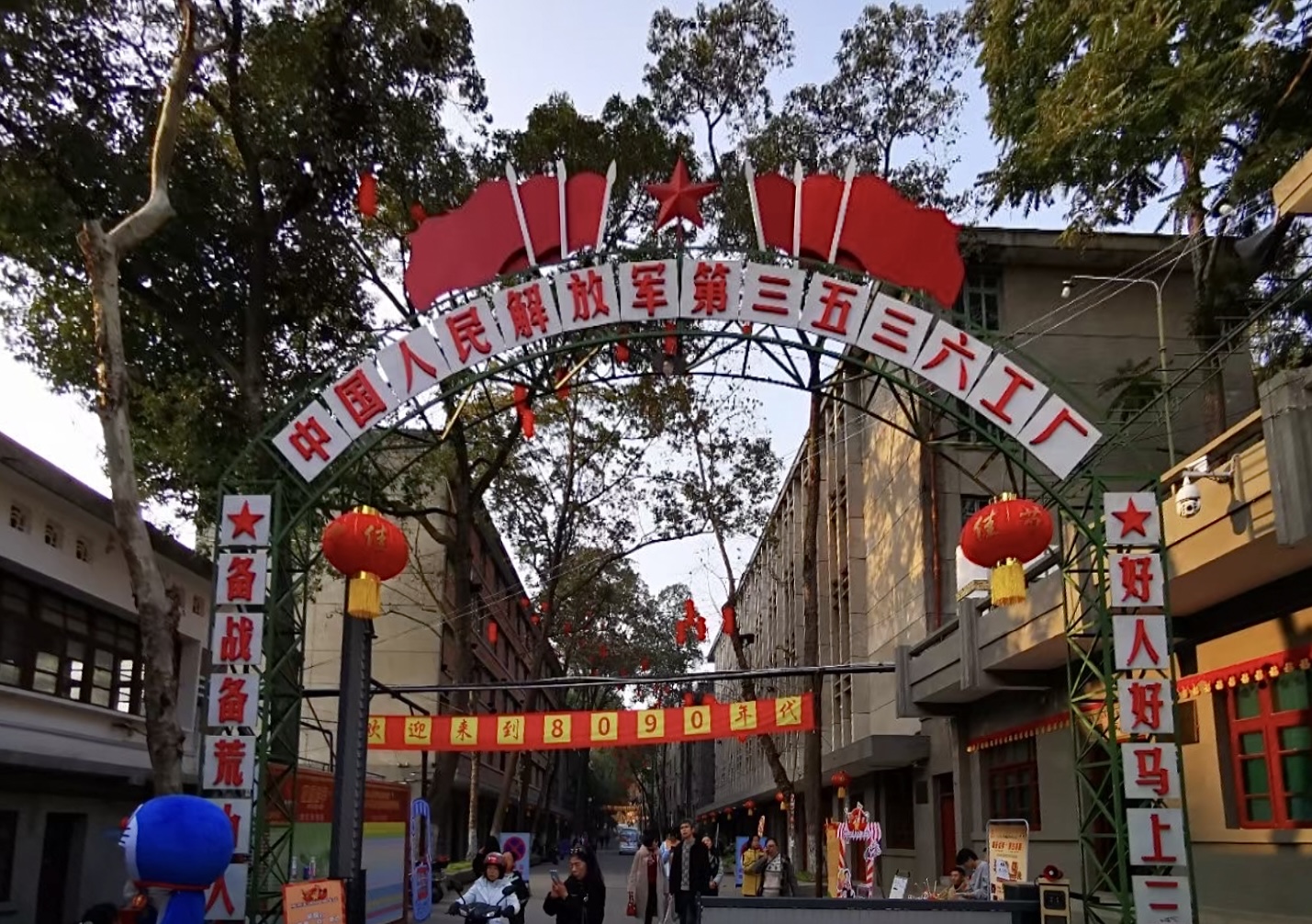 红墙黛瓦老街区、苍劲挺拔香樟树,再配合一间间有年代感的生产厂房,斑驳的老电影院与职工宿舍楼……漫步在射洪市瞿河镇3536三线城景区原3536军工厂旧址,看着历史文化街区极富年代感的厂房车间、招待所、办公楼、职工宿舍楼、机关幼儿园等建筑,仿佛回到了那段激情燃烧的岁月。其中,在由职工食堂改造成的3536三线建设博物馆中,讲解员向记者详细介绍了“三线建设”的时代背景、决策部署过程、建设布局、建设成果及3536军工厂的“前世今生”。透过一张张图片、一份份文件、一件件实物、一个个场景,令观者对“三线建设”时期军工人筚路蓝缕、艰苦开拓的拼搏精神有了深刻的认识和体会。