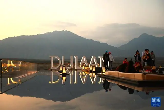10月4日,游客在位于宁夏银川市的图兰朵葡萄酒小镇欣赏贺兰山景色。