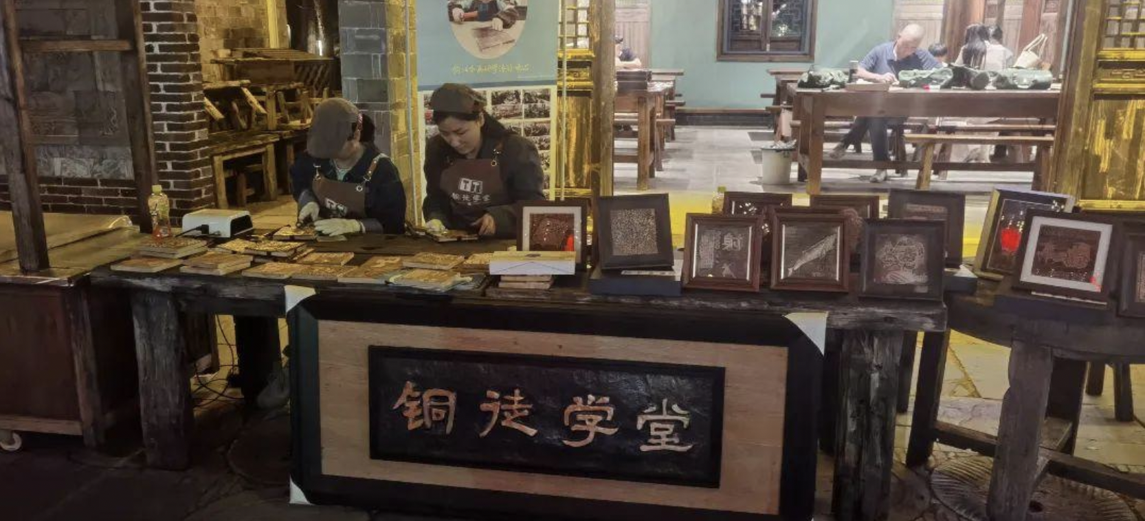 “咚咚咚……”犁桥水镇三元门附近的铜徒学堂传来敲敲打打的声音。这里,一场场妙趣横生的铜拓本画制作体验之旅正在开启。以纯铜为原料,参与者通过粘、敲、刻、擦、装五个步骤让一张张铜皮以独有的色泽和纹理变幻出精美的图案。“这对来铜旅游的八方游客来说,是在探秘铜陵文化、感受中华文明。一张张铜拓本画,是传播铜陵形象的符号、唱响青铜故事的‘名片’,而每个体验者都将成为铜陵文化和铜文化的宣传大使。”“铜徒学堂”负责人张兴胜说:“我们将不断创新课程设计、教学方法和体验形式,将研学与旅游相结合,融入铜工业旅游线路,提升铜陵美誉度,将铜徒学堂打造成铜文化研学游基地。”