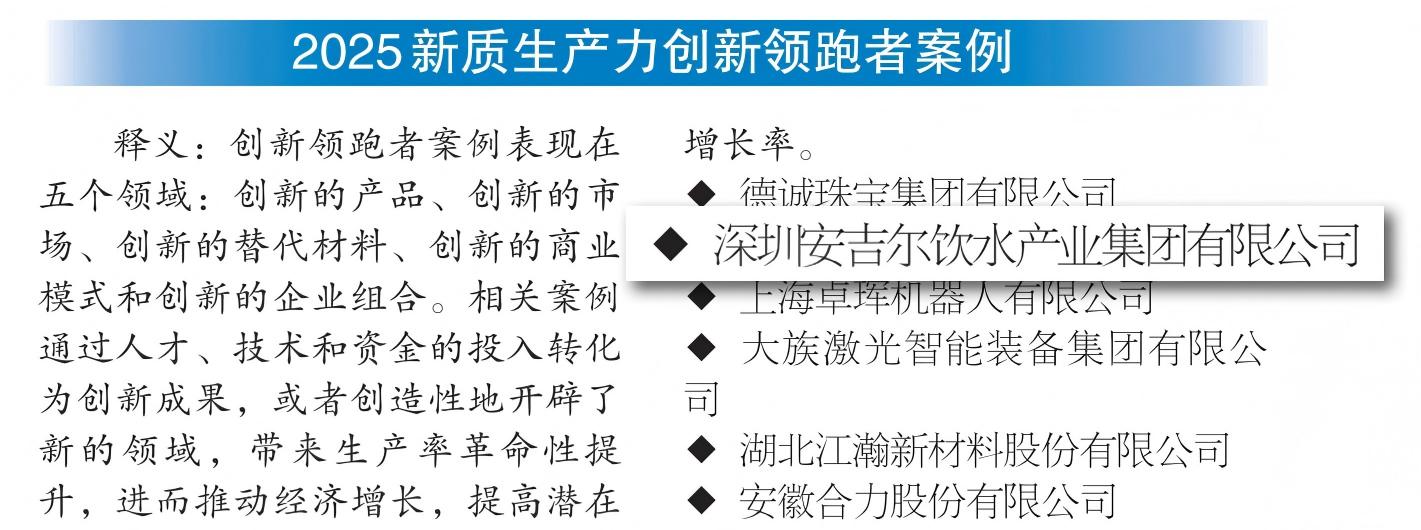 近日,由中国工业报社主办的《2025年寻找新质生产力领跑者案例》重磅发布,安吉尔凭借其在技术、产品、生态协同、渠道建设等方面的系统性创新,入选其中的“创新领跑者案例“,肯定了其作为民族企业以创新践行新发展理念的责任担当。