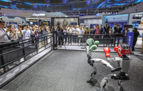 在第四届全球数字贸易博览会数智未来主题展区的杭州六小龙专区,宇树科技的人形机器人在进行格斗擂台赛。新华社记者 徐昱摄