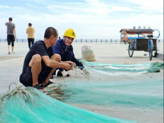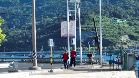 ▲9月1日开海前,大连供电公司长海县海洋岛供电所员工在巡查10千伏供电线路,确保海产品养殖和加工企业用电平稳。(关达摄)
