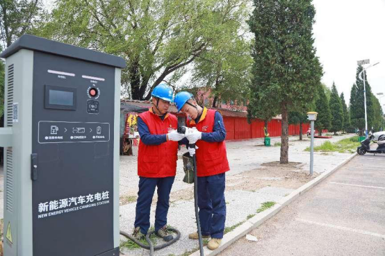 ▲国网辽宁电力(阜新格日勒)雷锋共产党员服务队队员正在检查新能源汽车充电桩用电设备运行情况。(魏晓丽摄)