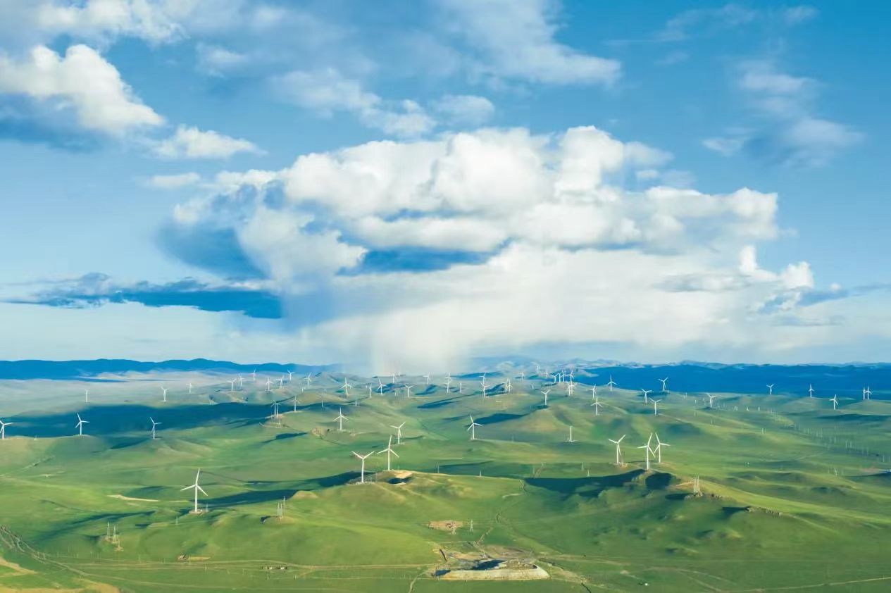 科尔沁草原腹地的群山间,266台风机迎风傲立、36万余块光伏板熠熠生辉,持续为霍林河循环经济局域电网供给绿色能源。