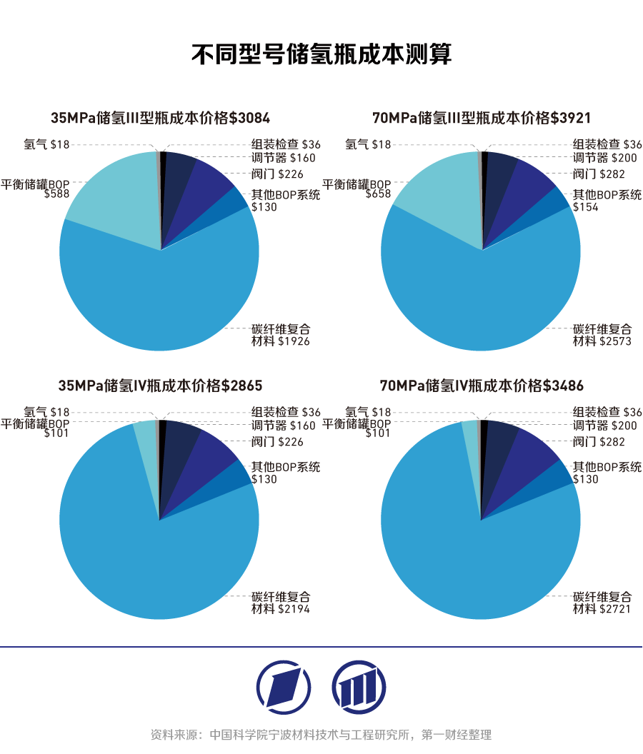 Ⅳ型储氢瓶不仅性能更优,成本也低于Ⅲ型储氢瓶。根据中国科学院宁波材料技术与工程研究所近期的测算,35MPa、70MPa的储氢Ⅲ型瓶成本价格分别为3084美元、3921美元,而35MPa、70MPa的储氢Ⅳ型瓶成本价格分别为2865美元和3486美元,分别低7%和11%。