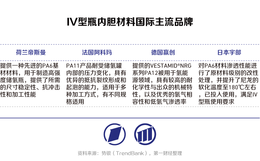 当前国内Ⅳ型储氢瓶内胆材料主要由国外企业供应,包括日本宇部兴产、荷兰帝斯曼、美国杜邦(塞拉尼斯)、法国阿科玛等,成本较高,是下一阶段国产化突破的重点。