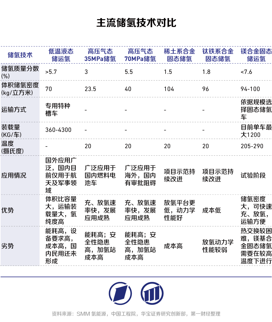 2023年4月,氢枫能源联合上海交通大学氢科学中心发布了第一代吨级镁基固态储运氢车(MH-100T),单车储氢量为高压气态储氢的3倍左右,实现了常温常压储氢。今年1月,氢枫能源与宝武镁业(002182.SZ)就镁基固态储氢业务签署了《上海氢枫能源技术有限公司与宝武镁业科技股份有限公司战略合作协议》。今年9月,江苏华镁时代全球首条百吨级镁基固态储氢材料生产线在我国投料试产一次性开车成功。