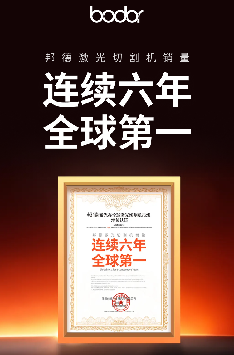 2025年3月,据前瞻产业研究院数据显示,邦德激光1000W及以上激光切割机销量实现连续六年全球第一1。