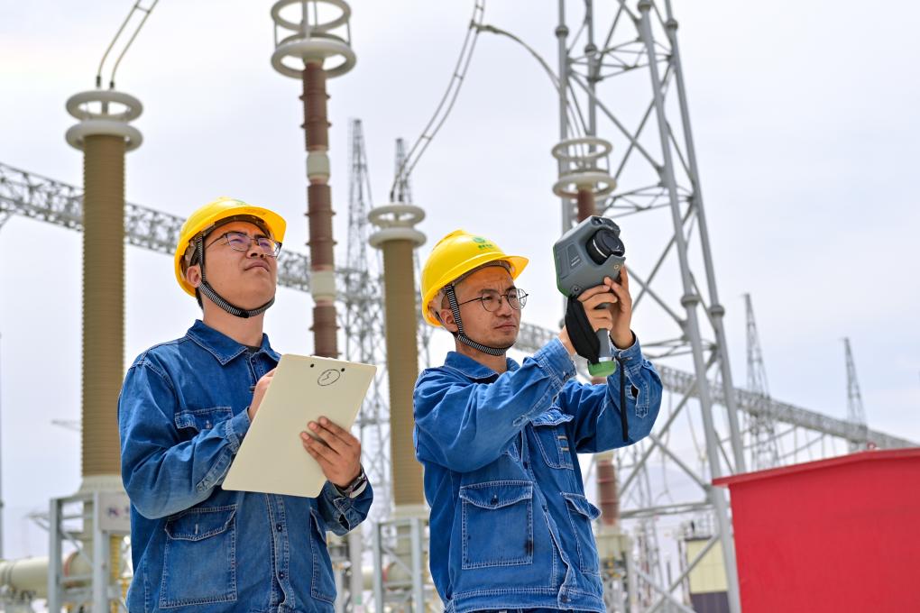 在新疆环塔里木盆地750千伏输变电工程若羌750千伏变电站,运检人员检测设备温度(6月27日摄)。新华社记者丁磊摄