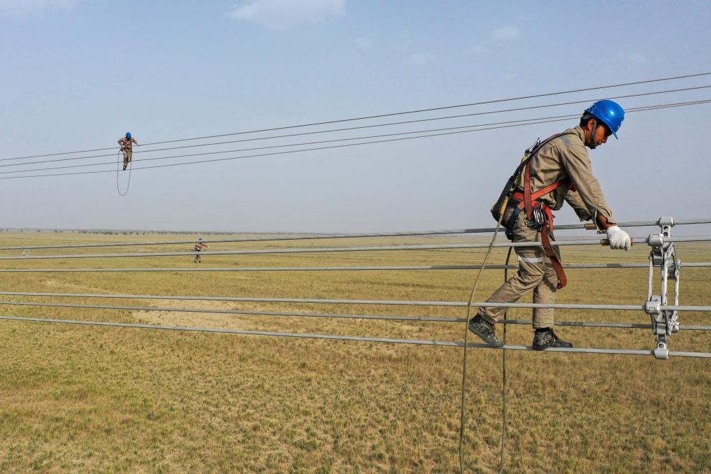 施工人员在且末-若羌750千伏线路开展走线消缺工作(6月24日摄,无人机照片)。新华社记者丁磊摄