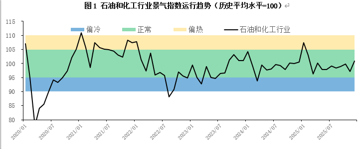 2025年12月,石油和化工行业景气指数回升至100.91,环比上涨3.7个百分点,总体呈现复苏迹象。从分指数看分化明显:石油和天然气开采业受低油价影响,“价跌利缩”状况更加突出,景气度连续下滑直至进入偏冷区间。而原油价格下跌为燃料加工业带来成本红利,行业景气度在11月因需求骤降明显下滑,12月随需求回稳再次大幅反弹。化学原料和化学制品制造业因下游行业去库存、新增采购需求减少,景气有所回落。橡胶、塑料及其他聚合物制品制造业通过“以价换量”,主动去库存,实现被动回暖。总体来看,石化行业景气指数在上下游分化的背景下实现上涨,结构性特征日益凸显。
