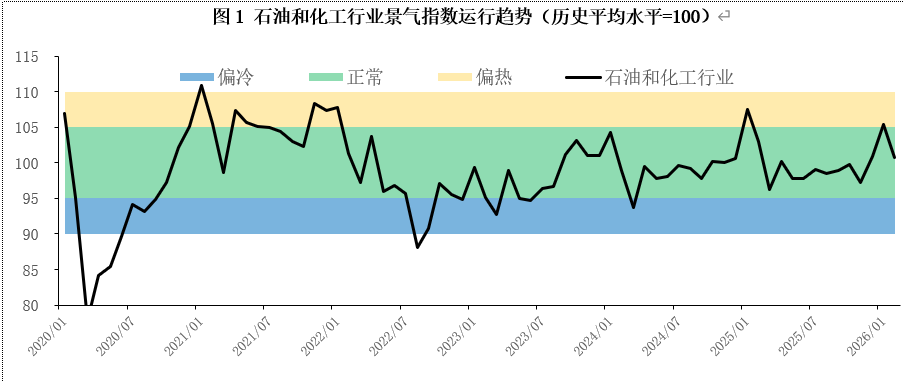 2026年2月,石油和化工行业景气指数为100.74,环比下降4.62个百分点。从历史数据看,每年1月因春节前备货,景气指数往往是年度峰值;2月则因春节长假生产放缓,景气指数普遍回落。2026年2月景气指数回调符合季节性规律,回调幅度基本在正常范围内,未出现超季节性恶化信号。分指数来看:
