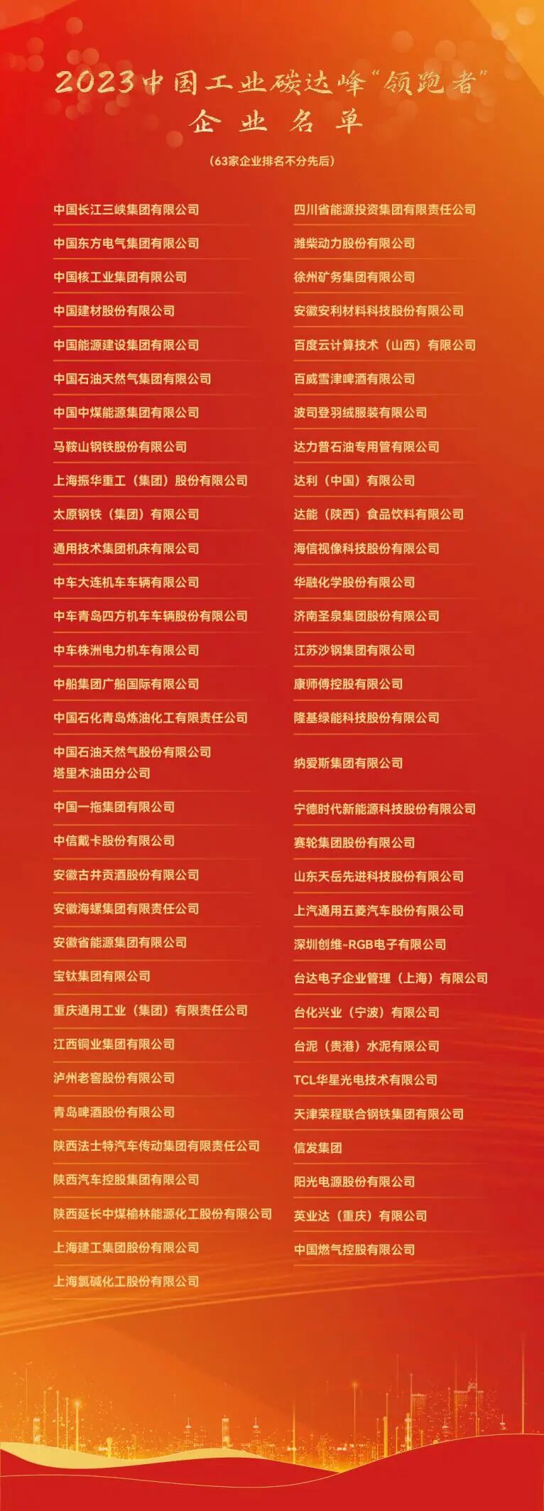 2024年1月14日,中国工业经济联合会在第二届中国工业碳达峰论坛上发布了63家2023中国工业碳达峰“领跑者”企业名单。