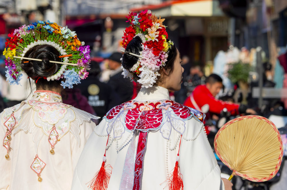 2024年1月26日,头戴簪花的游客在福建省泉州市蟳埔村游览。新华社记者魏培全摄