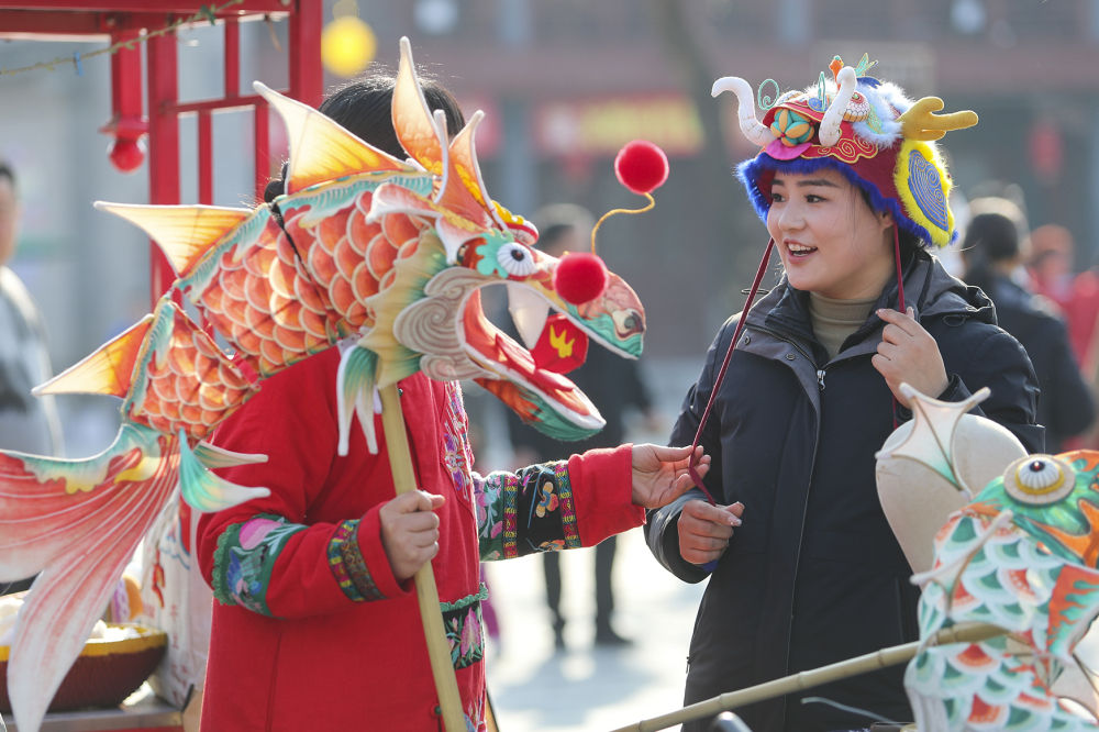 2024年2月13日,游客在河南商丘古城年货大集上购买龙帽。新华社发(李恒摄)