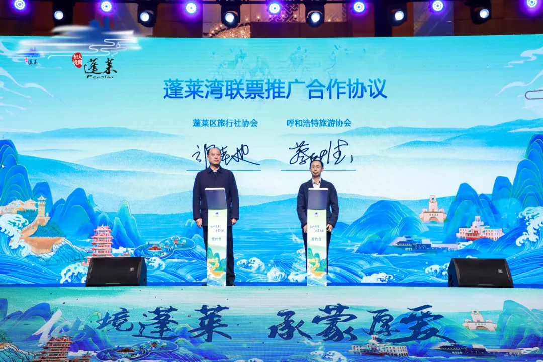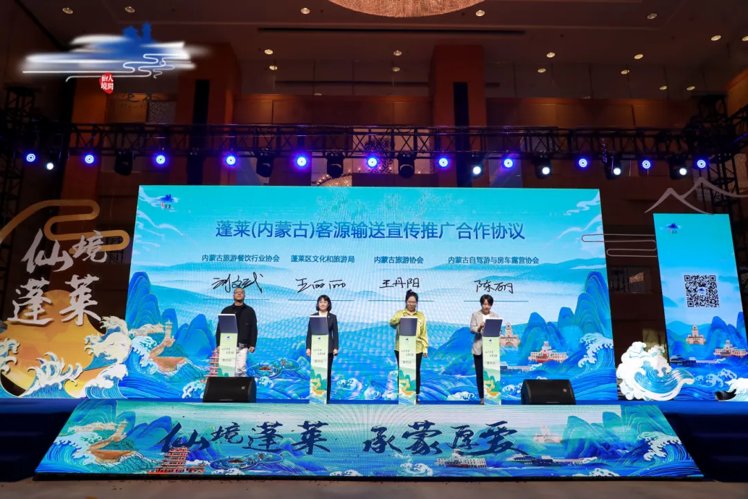 推介会现场蓬莱区文旅局与内蒙古各协会签署蓬莱(内蒙古)客源输送宣传推广合作协议;蓬莱区旅行社协会与呼和浩特市旅游协会签署蓬莱湾景区联票推广合作协议,为蓬莱和内蒙古提供更为广阔的合作空间,加深了两地之间的交流互通。