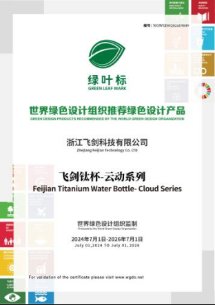 飞剑深知,可持续发展才能走向更远的未来。在浙江飞剑“「领鲜20」周年庆典”上,世界绿色设计组织为飞剑设计制造的“飞剑钛杯-云动系列”产品颁发证书。绿叶标是由世界绿色设计组织联合国际行业协会建立,是全球首个以绿色设计为产品评定依据的标识。秉承夏飞剑董事长“健康饮水”的理念,在后续的发展中,不止飞剑钛杯,飞剑旗下品牌仍会坚持绿色环保的方向,为消费者带去健康纯净的放心产品。