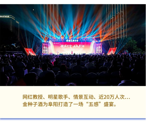 9月14日-16日,第五届金种子馥合香开窖节暨建厂75周年庆典在安徽省阜阳市隆重举行。入夜2000架无人机点亮阜城,群星齐聚召开演唱会,古代文学专家讲解淮河诗酒文化,持续开展的欧苏诗酒文化之夜、非遗民俗文化之夜……金种子在阜阳制造了一场满足听觉、视觉、味觉、嗅觉、触觉(即“五感”)的盛宴,把一场企业的经营活动延伸为产区的全民狂欢,将白酒与文化、旅游、消费深度融合,创造了一个酒企可持续发展的经典案例。