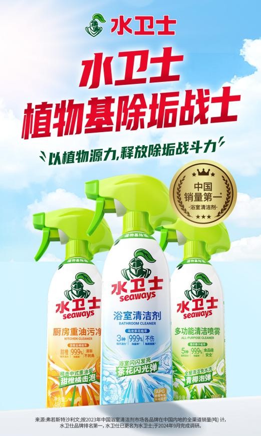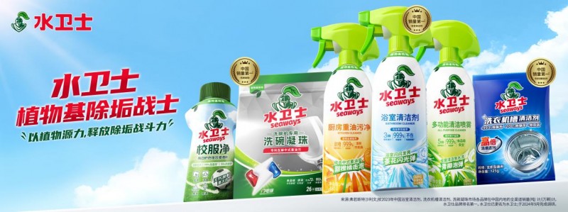 在产品升级上,水卫士重磅升级“植物基源力家族”三大明星单品——水卫士浴室清洁剂、水卫士厨房重油污净、水卫士多功能清洁喷雾。从引入“植物基”配方到产品视觉包装设计,全方位焕新升级产品概念以切实满足消费者对于家庭多场景清洁用品的需求。