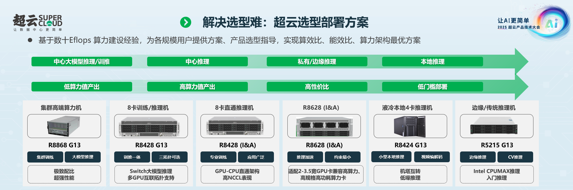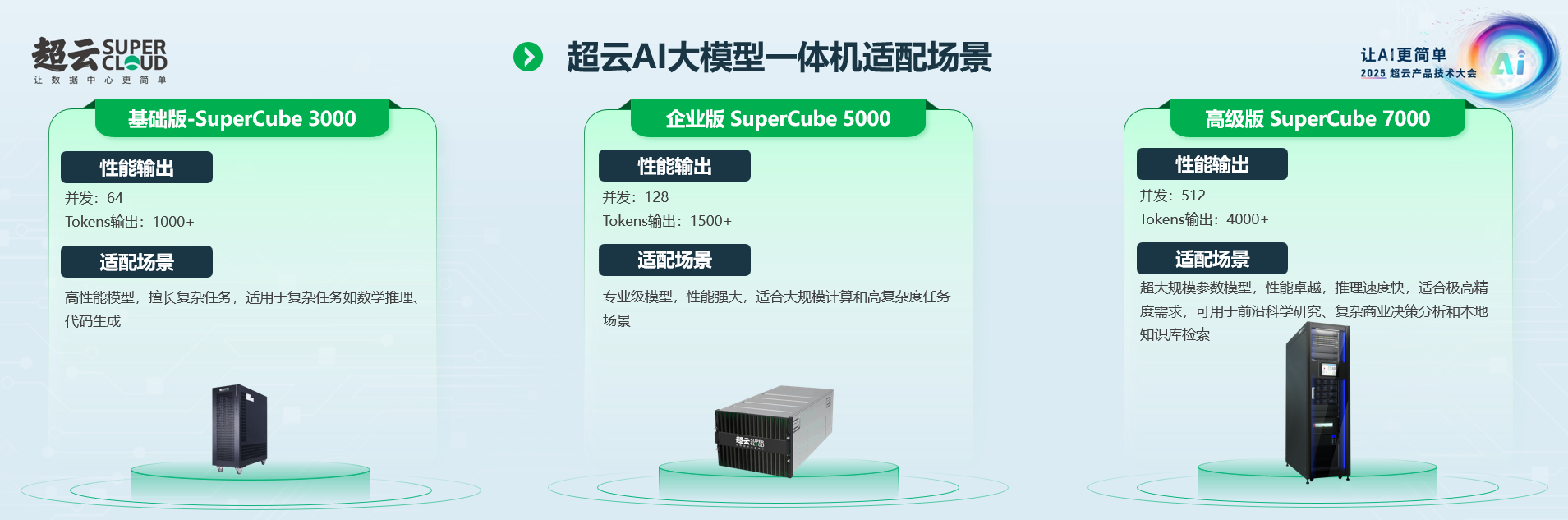 这正是超云推出SuperCube系列大模型一体机的核心动因——将算力集群、存储系统、网络架构、安全模块与预训练模型深度集成,实现开箱即用的"AI即服务"。