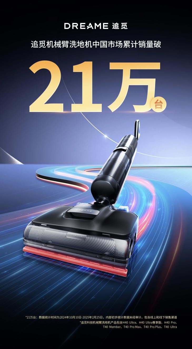 上市半年以来,追觅搭载机械臂技术的洗地机产品凭借其卓越的性能和创新的技术,迅速赢得了中国消费者的青睐。据统计,追觅机械臂技术洗地机产品在中国市场累计售卖已超21万台,彰显了消费者对于品牌的信赖,足以说明追觅机械臂洗地机的强劲实力。