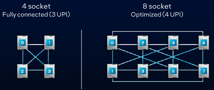 多路产品线是为4路、8路服务器准备的,售价较高,均被列入67xxP序列。该产品线的型号也比较容易理解,第三位数字大致对应了核数多寡;第四位数字是8或4,清晰体现了其原生的UPI直连多路支持能力。譬如6724P和6714P基于LCC,每个插槽有3个UPI链接,正好可以分别直连其他3个插座以构成全连接的4路系统,或通过节点控制器实现8路。其余尾数为8的处理器都有4个UPI,可以构成典型的8路系统。