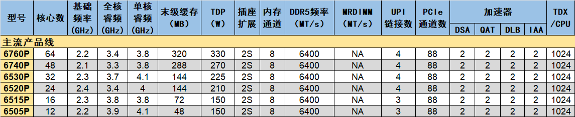 主流产品线的核数跨度在12个到64个之间,显然也使用了三种版本的内核封装。其中两款67x0P使用XCC,却没有开放MRDIMM的支持。不过好在二者的末级缓存都较大,平均每核心的缓存容量达到至少5MB。相比高性能产品线,主流产品线的加速器只开放了一半,分别只有2个,每CPU的TDX数量也减半了。
