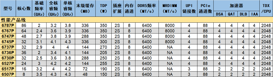 高性能产品线提供了最多86核的型号(6787P),多数型号的加速器全部打开。至强6的每个IO单元提供2个加速器模块,每个模块有DSA、QAT、DLB、IAA各1。两个IO单元就是4种加速器各4个。基于LCC的6517P和6507P提供的加速器是各两个。