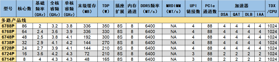 从产品定位角度看,至强6700/6500性能核处理器可以进一步细分为高性能、主流、多路、单路等产品线。