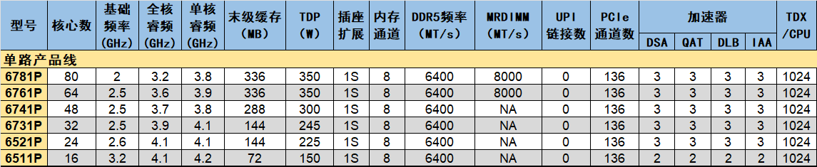 至强6700和6500性能核的单路产品线所有产品名称的第四位数字均为1,第三位数字与核数的对应关系也最为“整齐”,核数均为8的整倍数,没有特例。单路处理器不需要使用UPI互联,因此IO单元中原本可用作UPIx24的几个UIO可被用作x16的PCIe或CXL通道。最终它们的PCIe通道数比双路“同胞”们多了48个,达到136个。