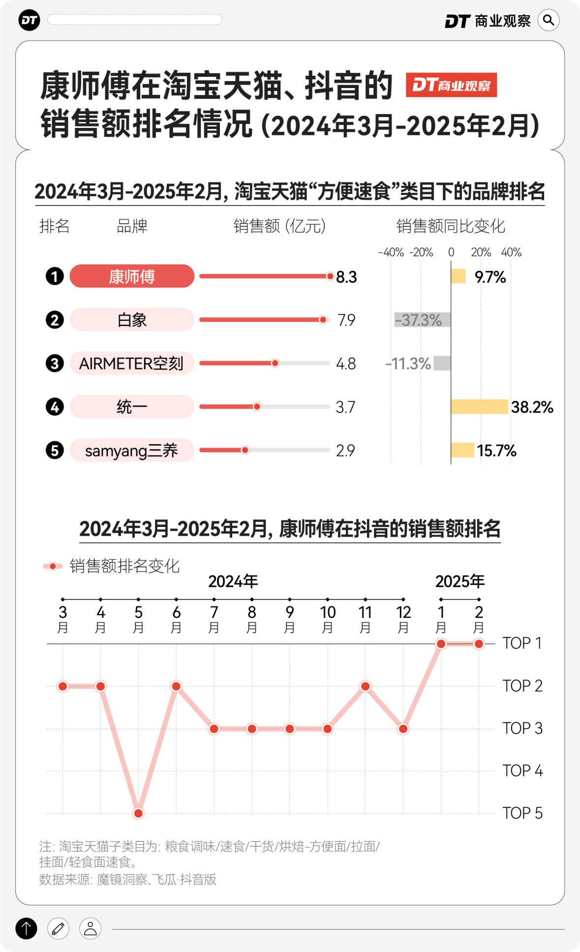根据魔镜洞察和飞瓜·抖音版数据,近一年,康师傅在淘宝天猫的累计销售额达到8.3亿,排名第一;而在近一年抖音方便面品类的销售额月榜上,康师傅在近两月的排名也有所提升,跃升至第一名。