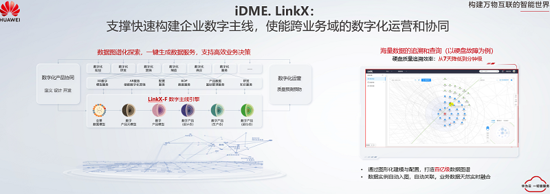 基于iDME.LinKX-F支撑快速构建跨领域数字主线,实现产品全生命周期数据端到端聚合、智能路由和精准追溯,使能跨业务域的数字化运营和协同。在华为全球数百万故障硬盘质量追溯场景中,通过iDME.LinkX-F数字主线技术,可通过多种物料编码查询硬盘去向,支撑百亿级数据进行筛选、关联、识别,高效接入硬盘追溯相关的3亿+条数据,高效编排数据服务并提供13个追溯类API,实现了硬盘产品百亿级数据7天->分钟级追溯,快速精准的进行硬盘质量问题排查和风险评估。同时,iDME.LinkX-F将持续深化在工业智能体、数字孪生等领域的应用落地,携手生态伙伴共创智能工业软件。