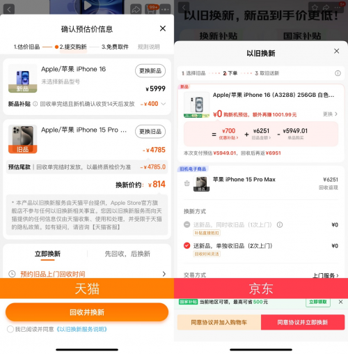 以iPhone15ProMax为例,在天猫平台,该机型的旧机回收价为4785元,而京东同款机型的回收价高达6251元,差价达1466元。更令人惊喜的是,京东还额外提供700元专属优惠补贴,进一步降低了换机门槛。若换购256G版本的iPhone16,天猫用户需补差价814元,而京东用户不仅无需补差价,还可获得约1002元的余额返还。两平台实际价差超过1800元,京东的优惠力度显而易见。