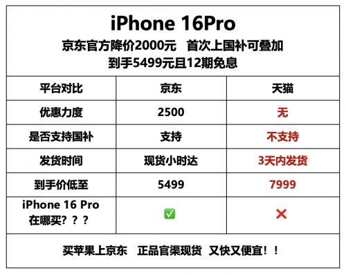 近日,苹果公司向渠道商下发了调价通知,苹果iPhone16ProMax所有容量版本降价160美元;iPhone16Pro的128GB版本降价176美元。值得关注的是,除了京东,苹果官网及主流电商平台官方旗舰店等线上渠道价格暂未调整。据网友透露,目前京东针对iPhone16Pro系列推出独家直降2000元优惠,iPhone16Pro首次支持国补到手价5499元起,还可享12期免息,iPhone16ProMax叠加直降、消费券、以旧换新补贴后可优惠2200元,到手价比天猫便宜太多!