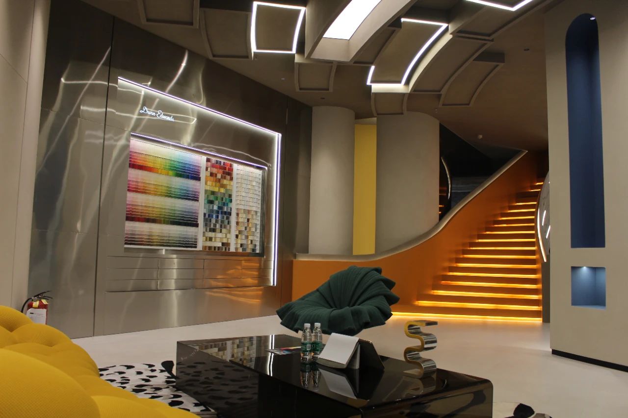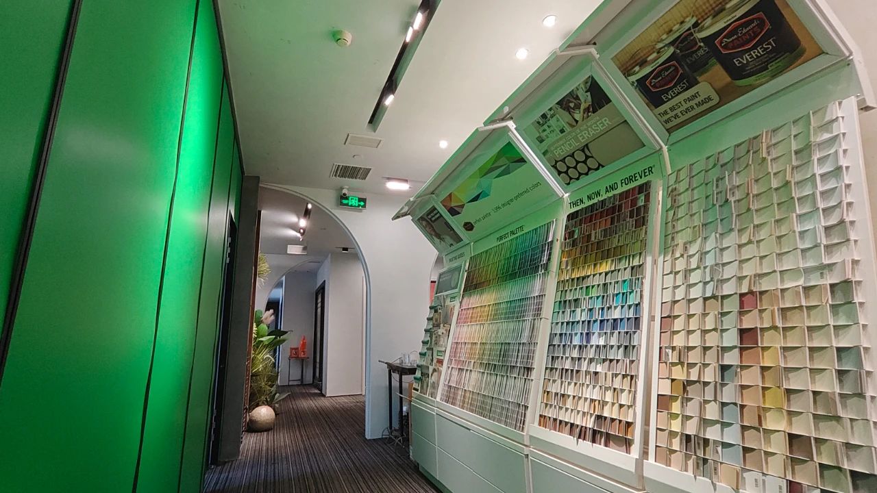 色彩是邓恩涂料的“独门绝技”之一。在中国区运营总部的过道旁,展示着当前市场上受欢迎的流行色彩