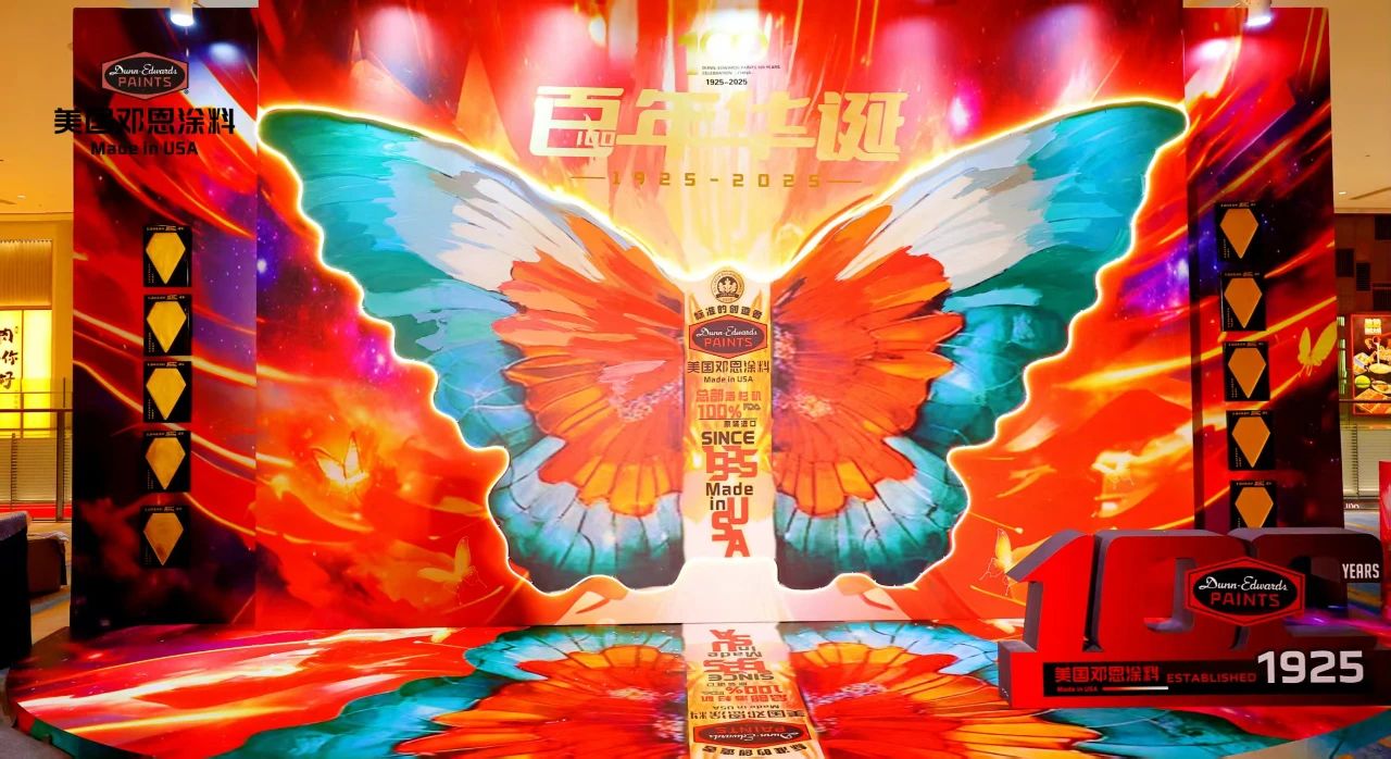 美国邓恩涂料年会暨100周年庆典现场。相比2024年的年会,今年邓恩涂料用了一幅更大的蝴蝶翅膀作为主背景,预示着品牌的蝶变与腾飞