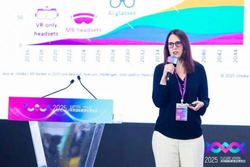大会特邀国际嘉宾分享前沿洞察。法国REAPSE咨询公司首席执行官、欧洲智能眼镜专家瓦莱丽·里法乌·坎杰洛西(ValérieRiffaud-Cangelosi)发表《智能眼镜:现在和未来》主题演讲。她以全球视角勾勒智能眼镜的技术路线图,指出5G、AR/VR和AI多模态融合是行业关键趋势。瓦莱丽强调,智能眼镜正从“信息显示工具”演变为“场景交互中枢”,在教育、医疗和工业领域应用潜力巨大。