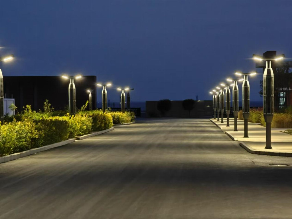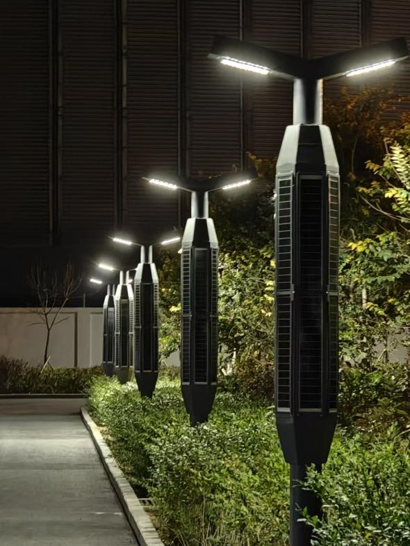 厂区207套路灯全部采用太阳能供电系统,创新设计四立面抱杆式太阳能板,适配准东地区高光照、强风、极寒环境特点,实现任意时段双面高效采光。通过时控、光感与电压智能检测三重策略,路灯可在连续阴雨天维持3-5天基础照明,为厂区提供可靠的照明。