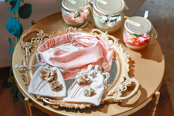 本次联名活动,LCV还为SABON定制了精致的烫金永生花发夹套组。大号发簪配合小号发夹,饰以细腻花瓣与金属叶脉,柔美而灵动。同时搭配SABON粉色缎面发带,轻覆发间,适合七夕佩戴或日常造型点缀,法式氛围感拉满。