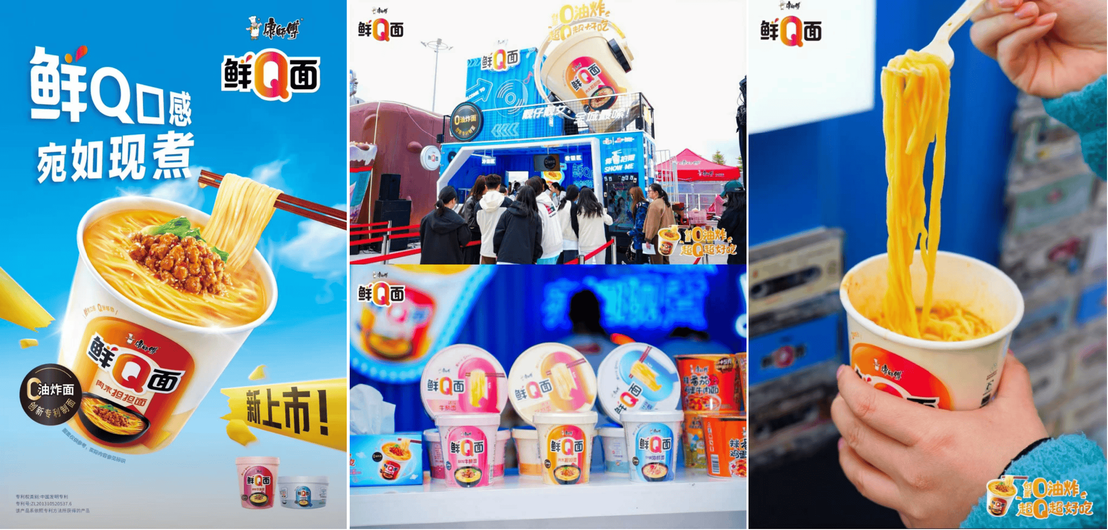在满足多种口味的基础上,康师傅还将目光瞄准“非油炸和面饼口感难以兼得”的行业痛点,力求用技术平衡口感,最终在“0油炸”专利技术的基础上,突破性地探索出“单篓预煮-冷水激活-强风干燥”工艺,推出兼顾健康与口感的“鲜Q面”。上市一年多时间,康师傅的鲜Q面不仅成为年轻人的健康新选择,也带领整个泡面行业朝着健康化方向发展。