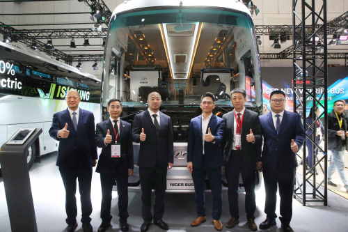 金龙汽车集团董事长陈锋(左三)等集团领导莅临发布会并在海格新V系客车前合影