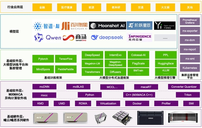 依托“自主创新+开放兼容”的双轨策略,沐曦股份打造了MXMACA软件栈,实现与CUDA生态的高度兼容,降低客户迁移成本。截至2025年3月,公司GPU产品累计销量突破2.5万颗,应用于北京、上海、杭州等地的10余个智算集群,覆盖国家人工智能公共算力平台、运营商智算平台及商业化智算中心,在教科研、金融、交通、能源、医疗健康、大文娱等领域形成标杆案例。