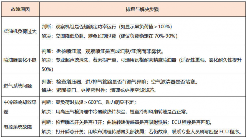 冒黑烟:本质是燃油燃烧不充分,多与进气系统、喷油系统、机组负荷相关;