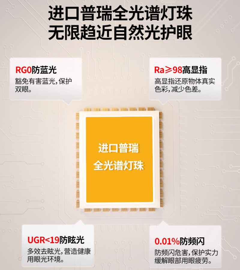 UGR<19防眩光:通过科学的布光设计和灯罩材质,有效抑制了令人不适的眩光。无论是孩子抬头瞬间,还是在客厅走动,都避免了强光直射眼睛的刺眼感,营造出柔和的光环境。