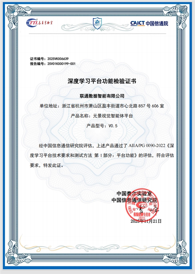 近日,联通元景视觉智能体平台通过信通院首批深度学习平台功能评估。评估依据《深度学习平台技术要求和测试方法》,聚焦“数据-训练-推理-服务”四大核心能力域,对“元景视觉智能体平台”进行了全方位的严格测试。评测结果显示,该产品在数据管理、数据标注、模型训练、模型推理、视觉智能体应用开发、模型应用部署等方面均表现优异。
