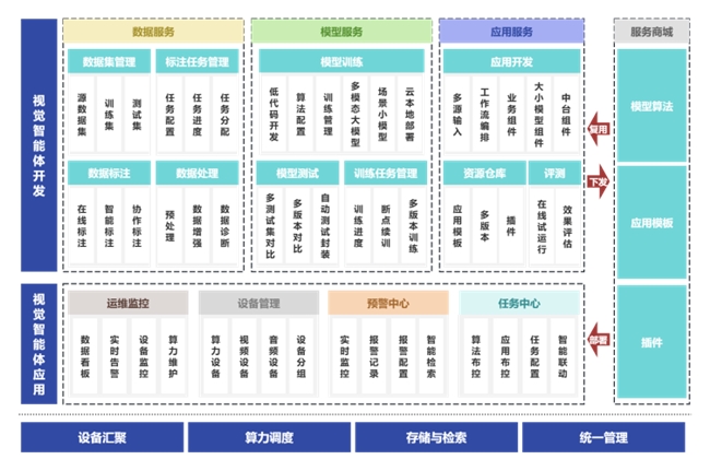 平台由两大核心子平台构成:视觉智能体开发平台专注于视觉类模型的开发,提供从数据管理、标注、训练到测试的一站式开发能力;视觉智能体应用平台专注于视觉类模型和智能体的使用,提供部署、多源视频接入、算力调度、智能分析与预警处置能力。