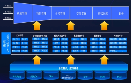 针对该企业的痛点,蓝凌为其打造了基于MK低代码平台的智能CRM解决方案,聚焦企业LTC全流程实现三大重构,全面激活企业数智能力。